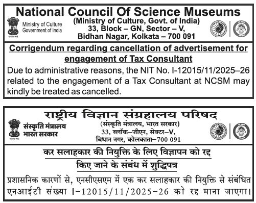 Due to administrative reasons, the NIT No. I-12015/11/2025–26 related to the engagement of a Tax Consultant at NCSM may kindly be treated as cancelled.