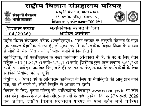 For details, please log on to www.ncsm.gov.in, the official website of the Council. Applications along with the required documents & credentials should reach to the Secretary, National Council of Science Museums within 27th February, 2026.
